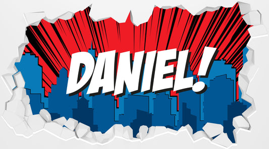 Personalised Name Superhero Cityscape Broken Wall Sticker