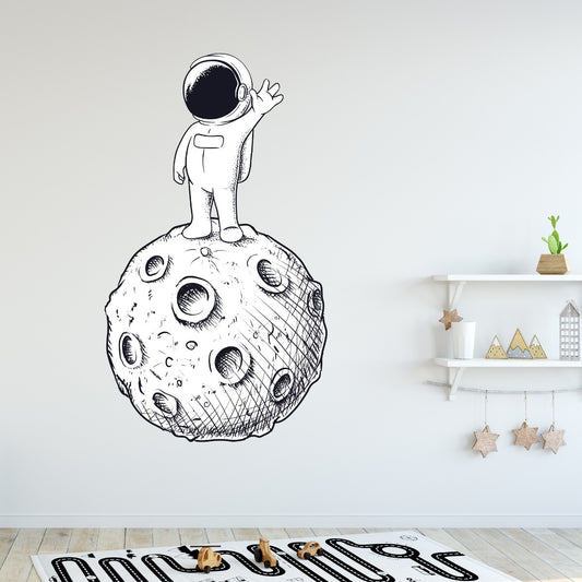 Space Wall Sticker - Astronaut Stood Waving on Moon Cartoon