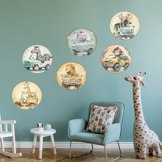 Watercolour Jungle Animal Wall Sticker - Six Animals in Jeeps Decal Set Wall Art