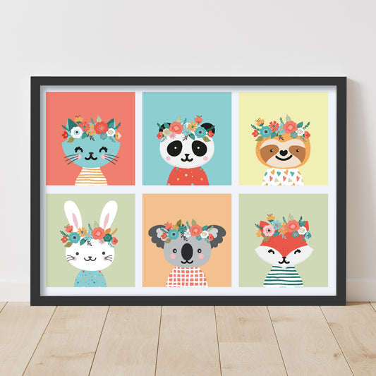 Animal Print - Animals With Floral Headbands Print Wall Art