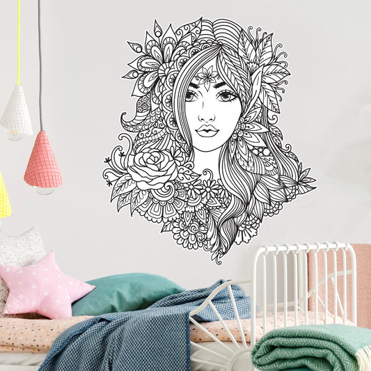 Mandala Wall Sticker - Black and White Women's Face and Mandala Pattern