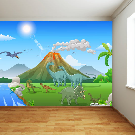 Dinosaur Wall Mural - Cartoon Dinosaur Land with Erupting Volcano Full Wall Mural