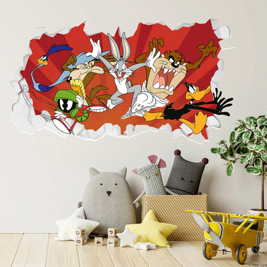 Looney Tunes Wall Sticker - Group Jumping Out of Broken Wall Decal Art