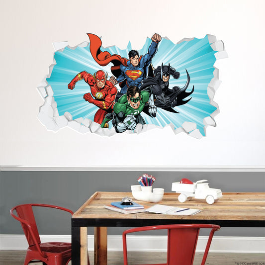 Justice League Wall Sticker - 4 Heroes Bursting Through Broken Wall Decal DC Superhero Art
