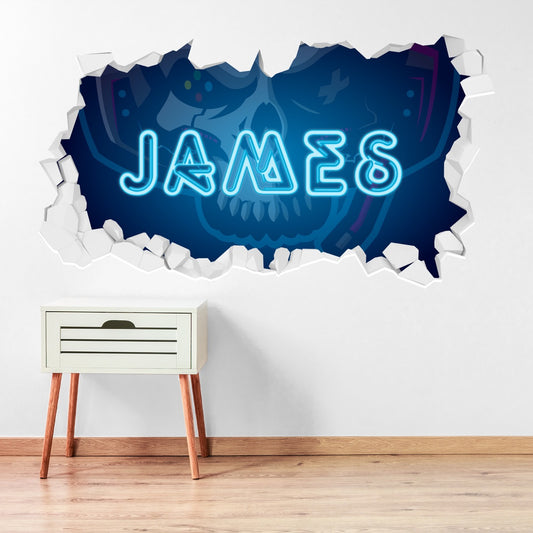 Gaming Wall Sticker - Gamer Skull Neon Personalised Name Broken Wall