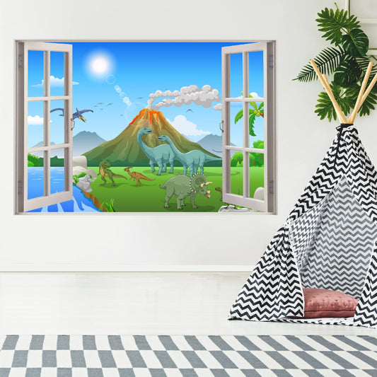 Dinosaur Wall Sticker - Cartoon Dinosaur Land with Erupting Volcano Window Wall