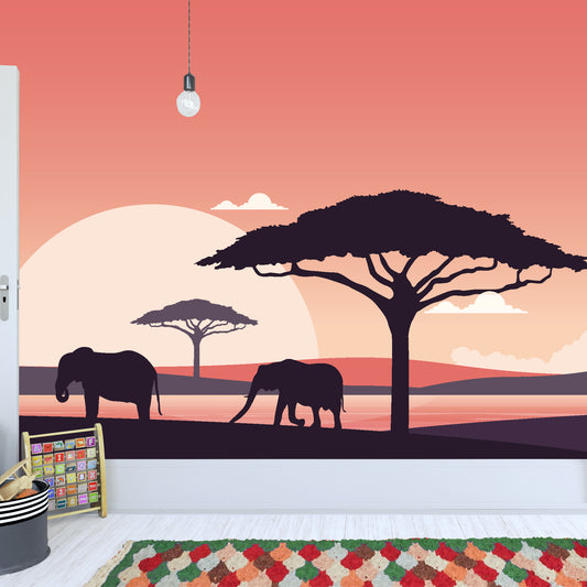 Elephant Safari At Sunset Full Wall Mural