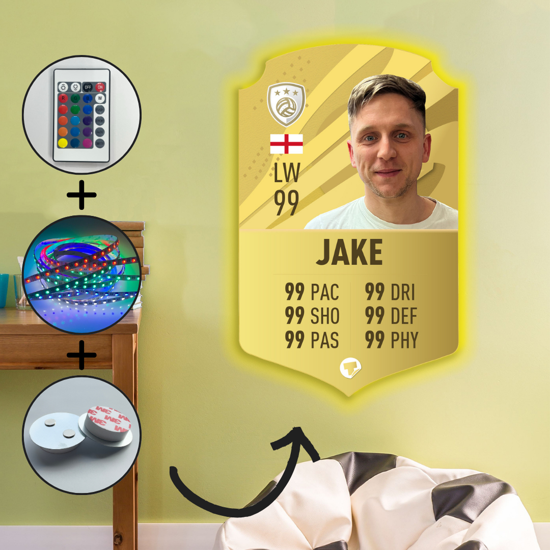 Showcase your personalised football card in style with our Backlit LED & Magnetic Mount Kit. Easy to put up, the magnetic mount makes it a breeze to secure your football card to the wall. The vibrant LED lights offer 16 color options and multiple lighting effects—plus, no messy wires! Choose your favourite colour or dynamic effect to make your personalised football stats card the ultimate room highlight. 3x AAA batteries required.