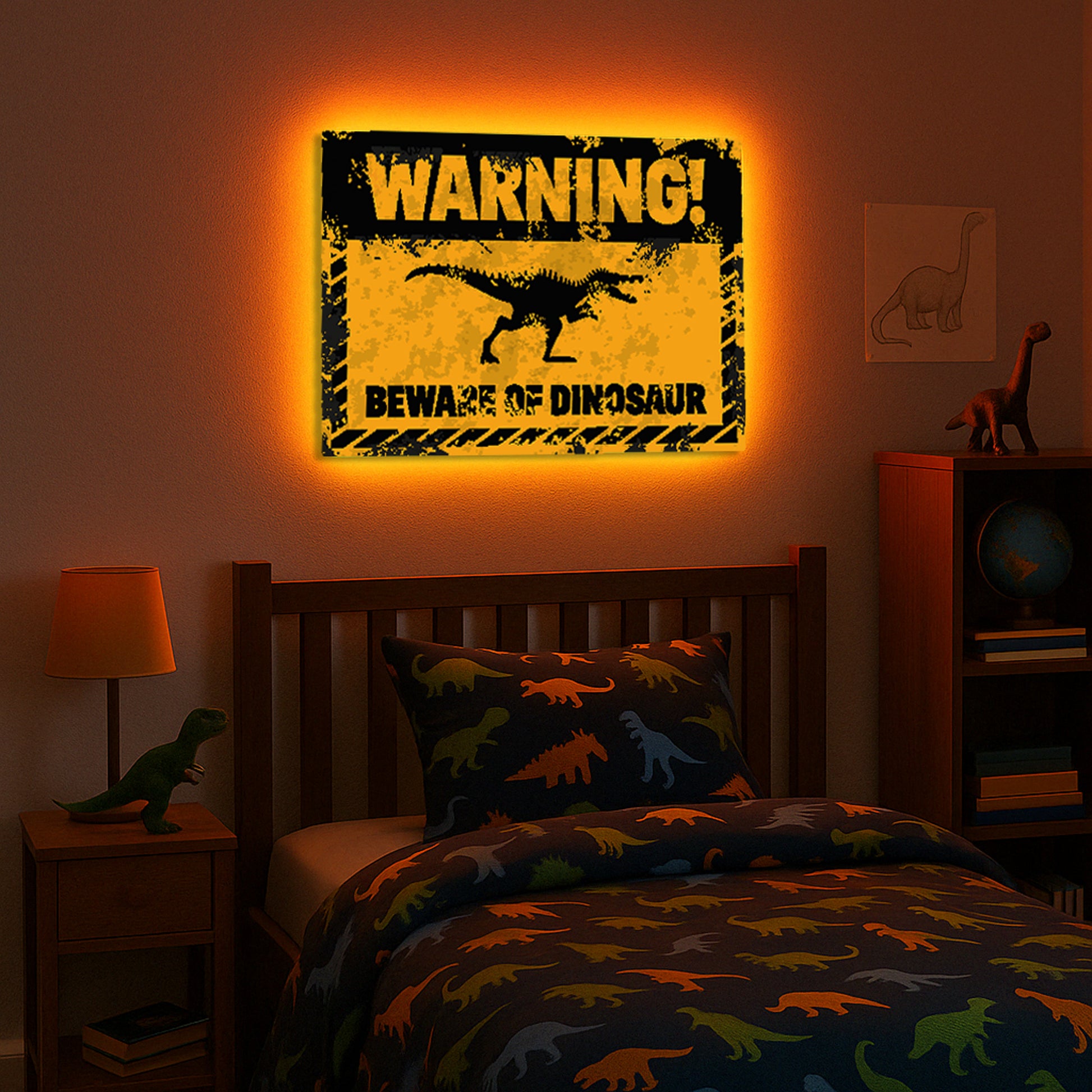 Transform your space with this Dinosaur Warning Sign LED Backlit Mounted Wall Art!
