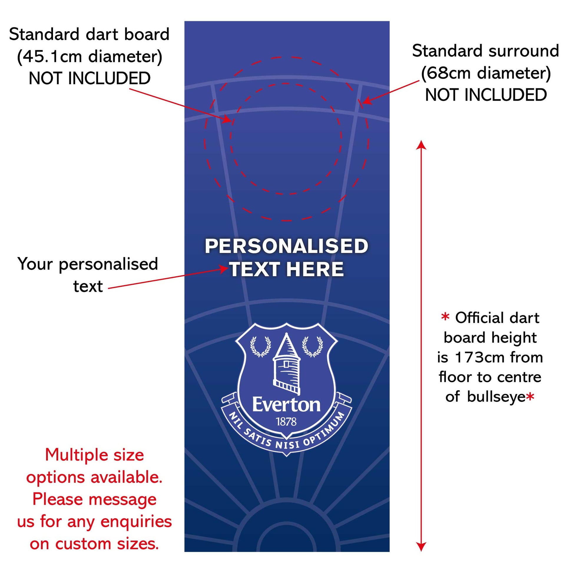 Contents: x1 Everton Dart Board Backdrop Wall Sticker with Personalised Text (in your chosen size). If you would not like any custom text on your item, simply enter 'No Text' in the box.