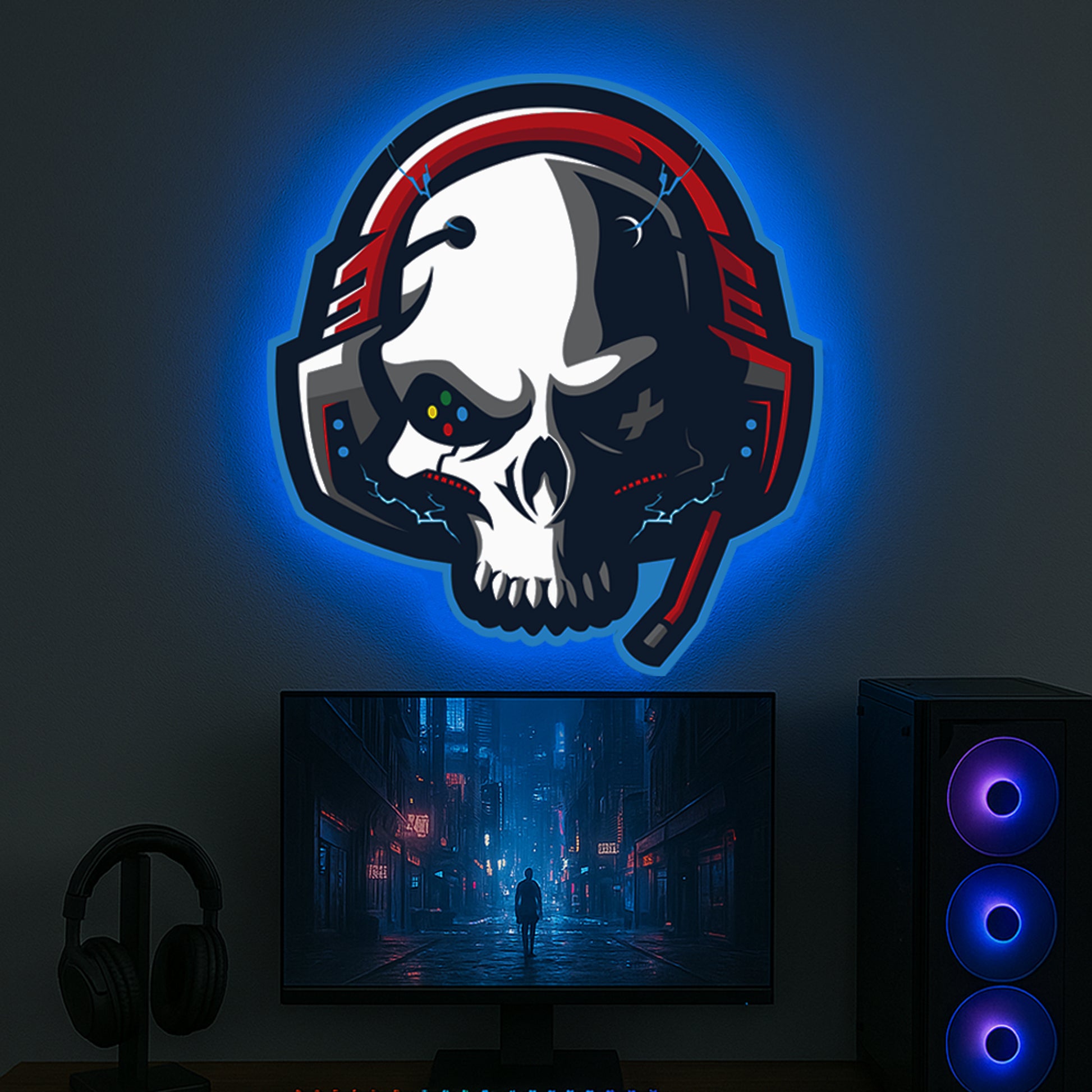 Transform your space with this Gamer Skull Headset LED Backlit Mounted Wall Art!