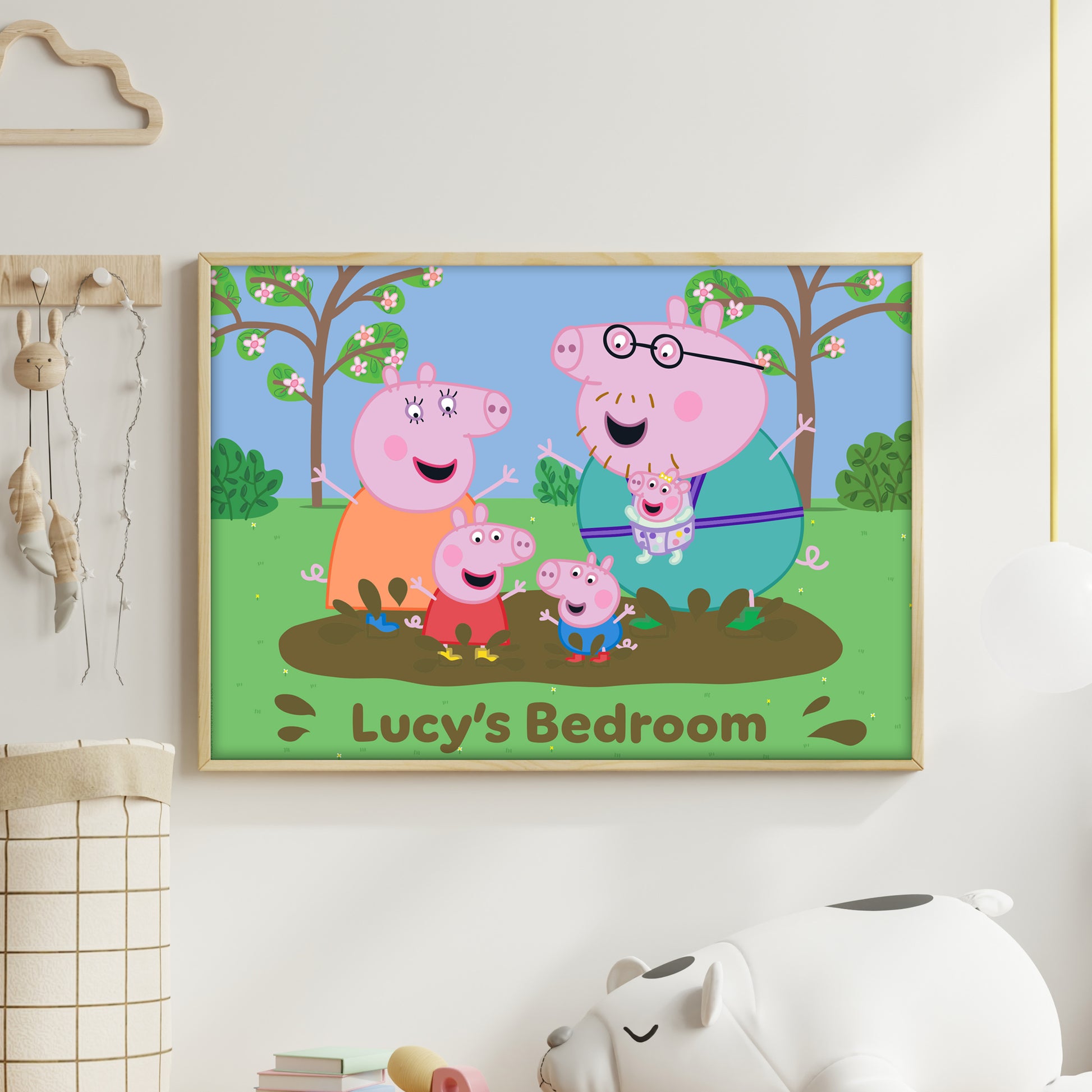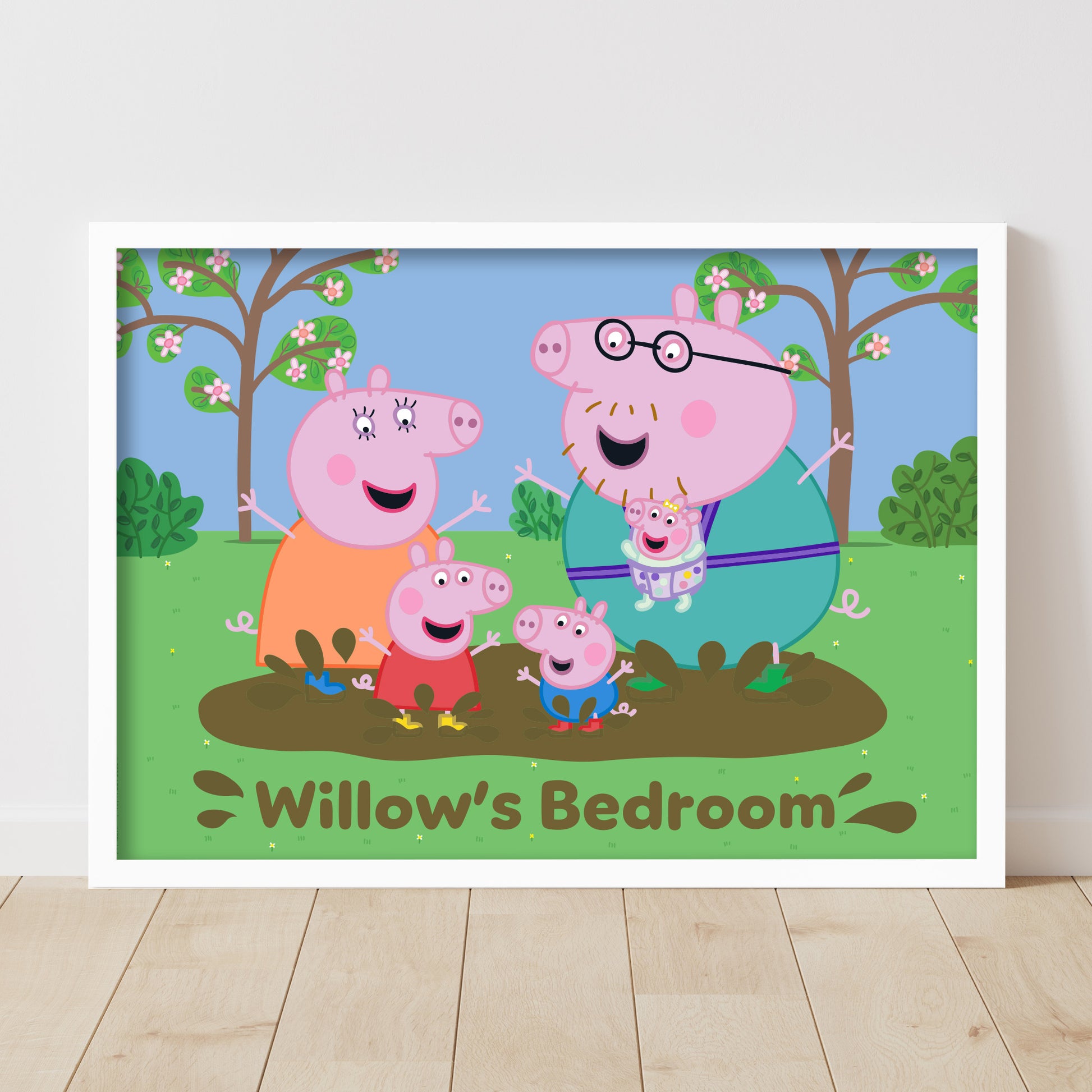 Peppa Pig Print - Peppa and Family Muddy Puddle Personalised Name Poster Wall Art